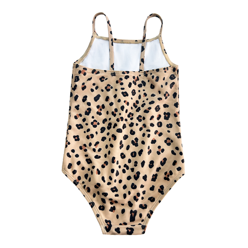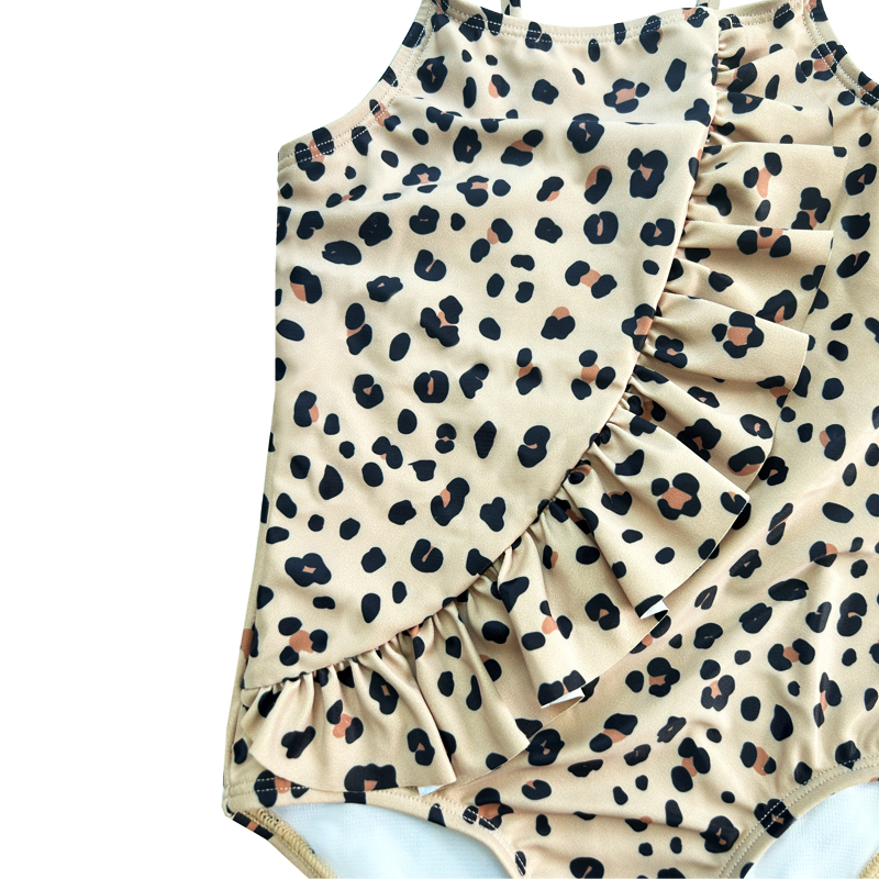 * tryck, leopardtryckstecknad, hög sträcka, ruffled axelband, en-piece.