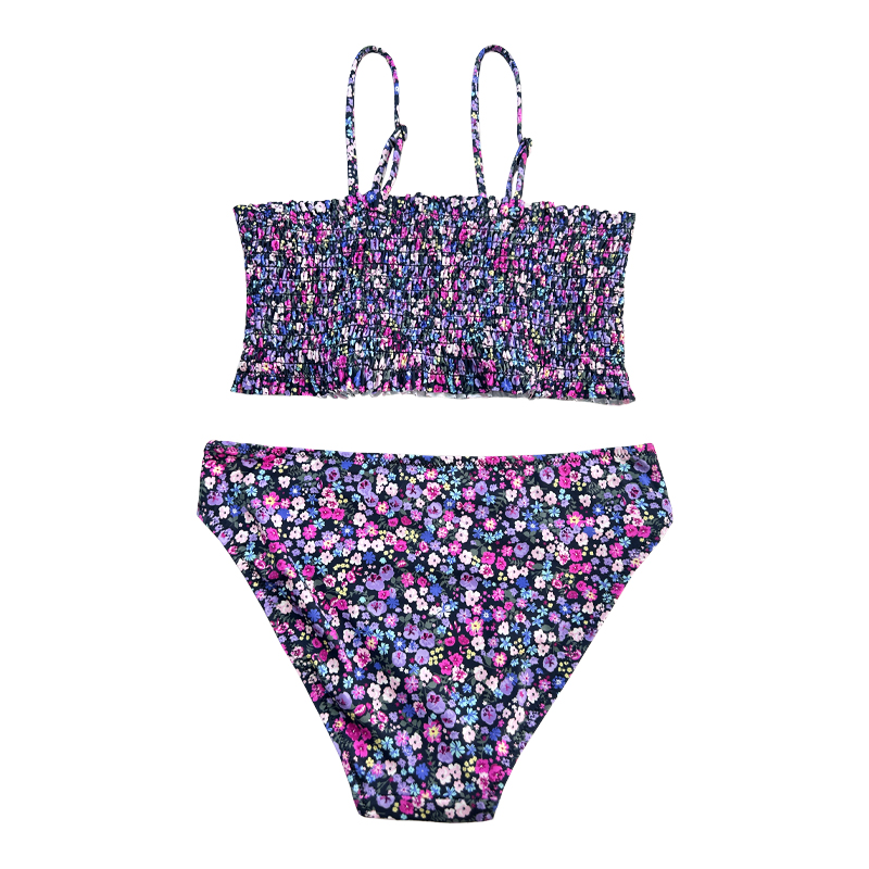 Tvådelar barns baddräkt med lila blommor dragskon.